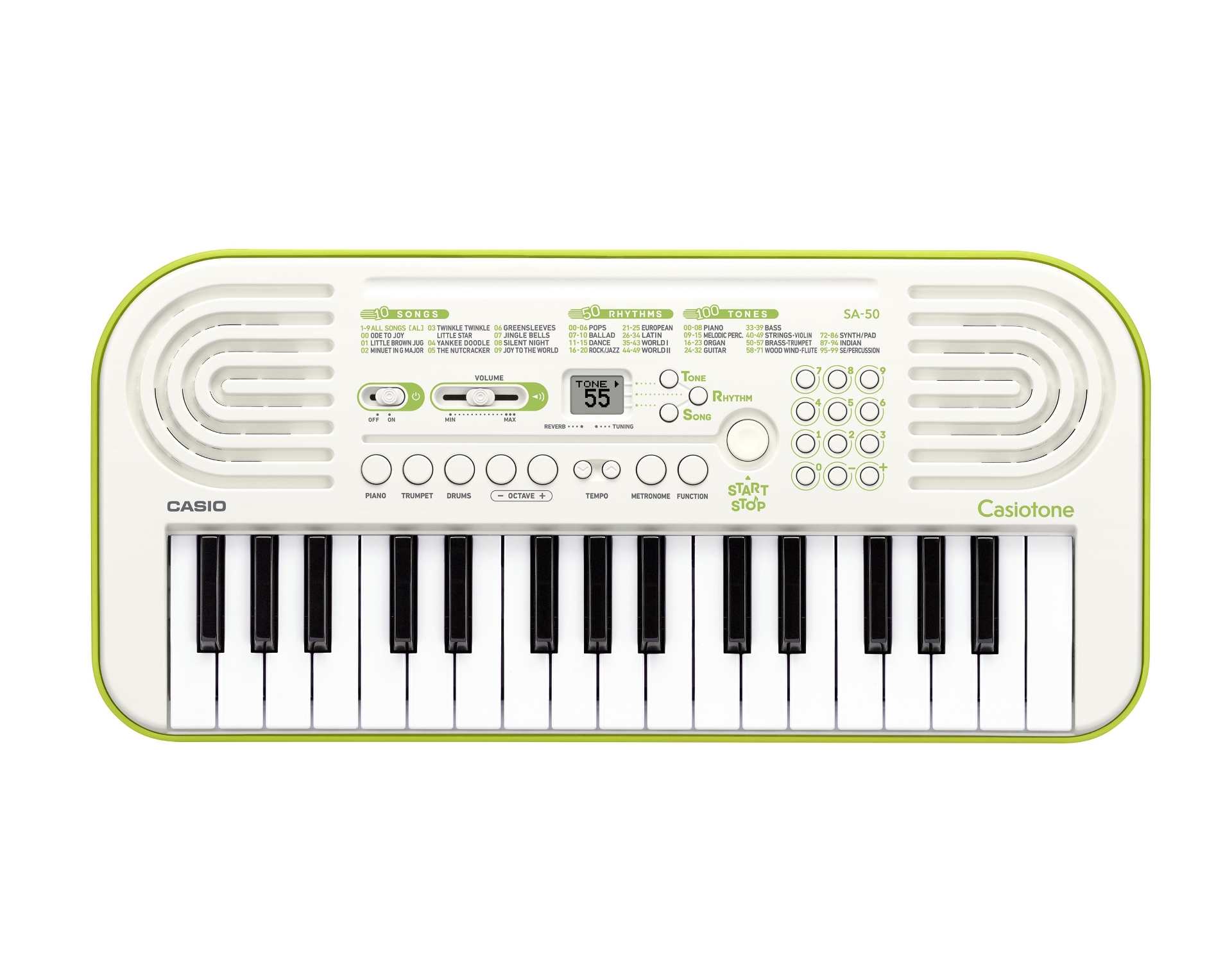 Con il nuovo modello SA-50 Casio raggiunge ancora una volta il suo obiettivo di rendere la musica accessibile a tutti, grandi e piccoli. La nuova mini tastiera SA-50 si distingue per un accesso ancora più semplice alle principali funzioni e includono per la prima volta metronomo e riverbero, nonché transpose e octave shift.