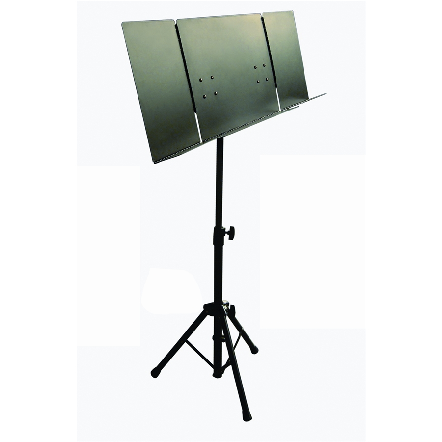 Leggio in acciaio con piano ripiegabile, larghezza 3 pagine. Fabbricato utilizzando un resistente tubolare in acciaio e componenti di ottima qualità. Verniciatura a fuoco antigraffio e antiriflesso nero smaltato. Comodo per partiture d'orchestra.